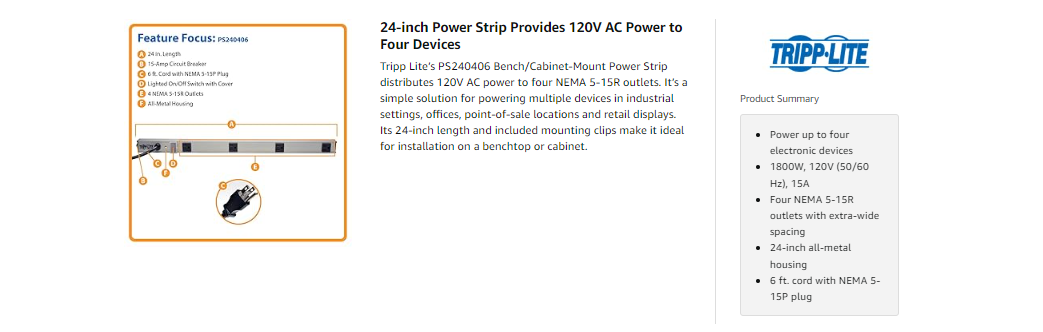 The PS240406 has four NEMA 5-15R outlets to provide 120V power to standard electronic equipment. The outlets feature extra-wide 5.67-inch center-to-center spacing along the 24-inch housing to accommodate most AC adapters and transformers without blocking adjacent outlets. This power strip has a 6 ft. cord with NEMA 5-15P plug.