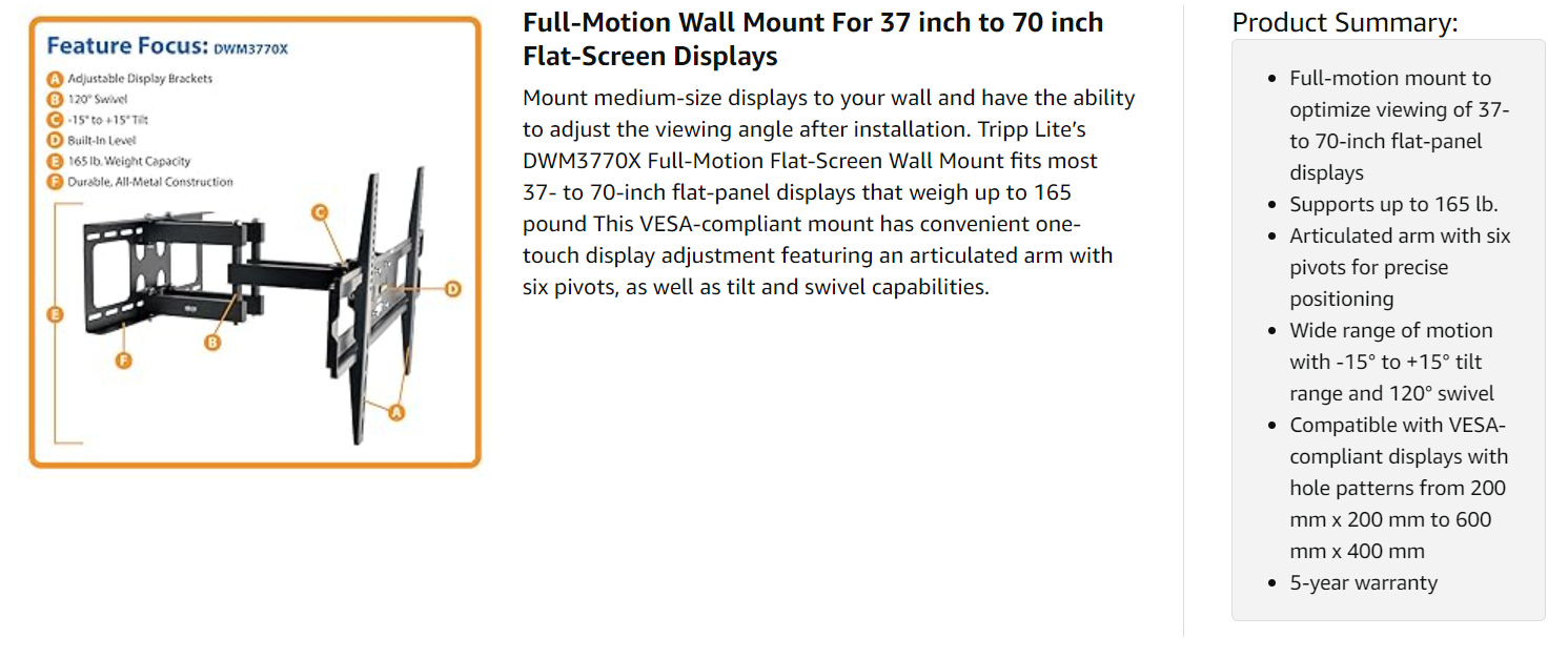 The DWM3770X has a durable, all-metal frame that supports displays weighing up to 165 pound and withstands the stress of repeated adjustments. The frame has a powder-coated finish to resist scratches.
