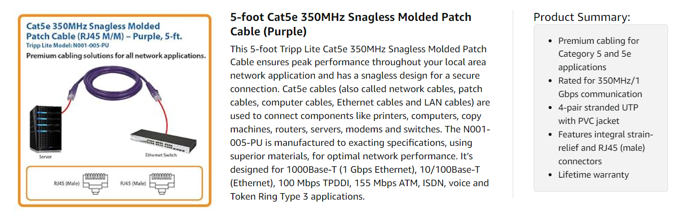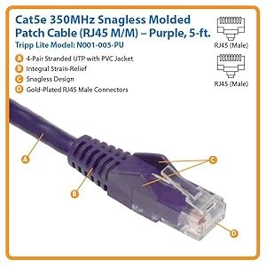 For peace of mind, this five-foot Tripp Lite Cat5e 350MHz Snagless Molded Patch Cable comes backed by a lifetime warranty. The N001-005-PU is manufactured in compliance with strict RoHS specifications, reflecting Tripp Lite’s commitment to environmental responsibility.