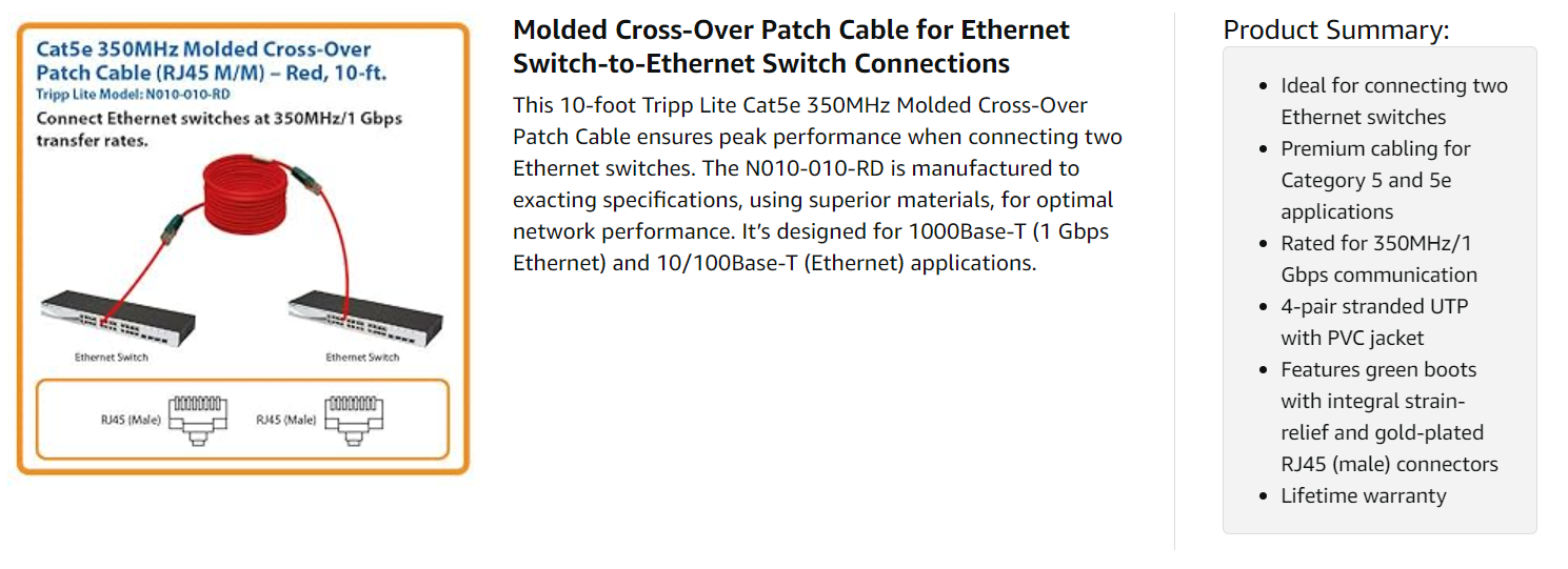 For peace of mind, this 10-foot Tripp Lite Cat5e 350MHz Molded Cross-Over Patch Cable comes backed by a lifetime warranty. The N010-010-RD is manufactured in compliance with strict RoHS specifications, reflecting Tripp Lite’s commitment to environmental responsibility.