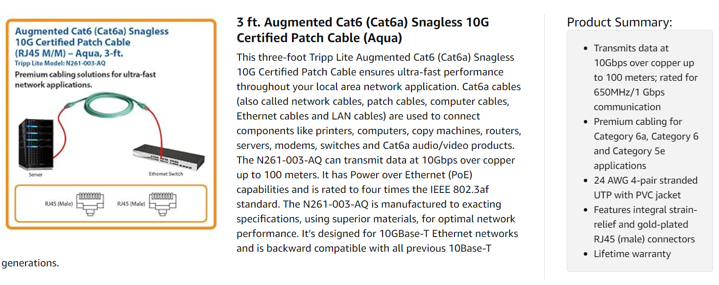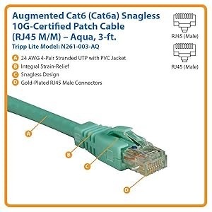 For peace of mind, this Tripp Lite Augmented Cat6 (Cat6a) Snagless 10G Certified Patch Cable comes backed by a lifetime warranty. It’s manufactured in compliance with strict RoHS specifications, reflecting Tripp Lite’s commitment to environmental responsibility.