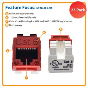 This convenient 25-pack of Tripp Lite’s Cat6/Cat5e 110-Style Punch-Down Keystone Jacks provides flexibility in Cat6 and Cat5e installations. The jacks feature a uniquely patterned printed circuit board that delivers Cat6 250 MHz performance. They also have dual color-coded labeling for both 568A and 568B (258A) wiring schemes. Jacks have a white housing and mount in conventional face plates, outlet boxes and panels.