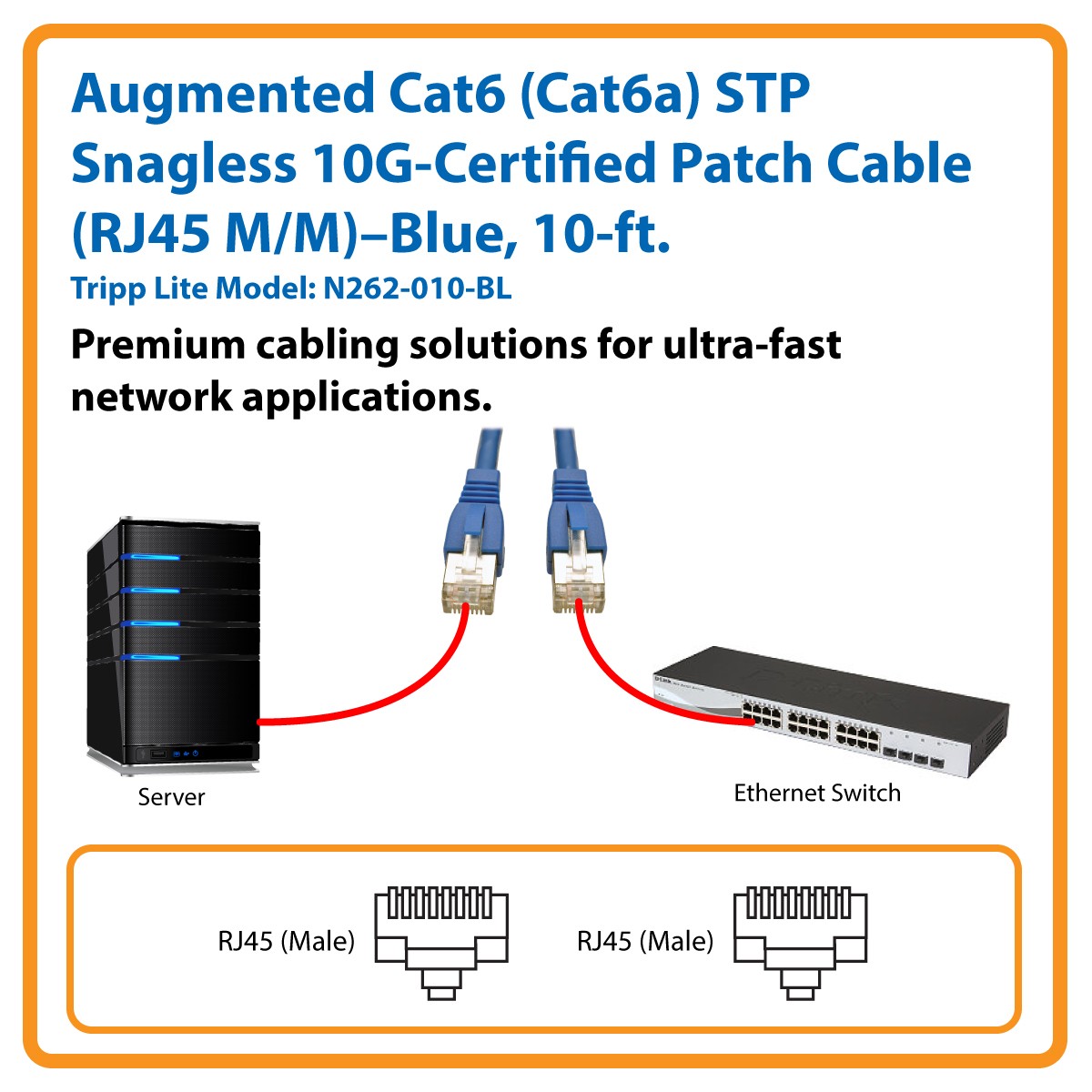 Enjoy data transfer speeds up to 10 Gbps when connecting with Tripp Lite’s N262-005-BL Augmented Cat6 (Cat6a) STP Snagless Patch Cable. Ideal for 10GBaseT Ethernet networks and Power over Ethernet applications, this five-foot cable is also PoE-rated to four times the IEEE 802.3at-2009 standard and backward compatible with all previous 10BaseT generations.