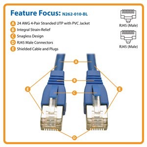 Made from premium 26 AWG 4-pair shielded copper to protect against line noise and EMI/RFI interference, each Cat6a cable is individually tested and certified on Fluke equipment (test results available upon request). The N262-010-BL is compatible with T568A/B wiring standards, ETL- and UL-verified to meet national safety standards, and meets IEEE 802.3af and DTE power standards.