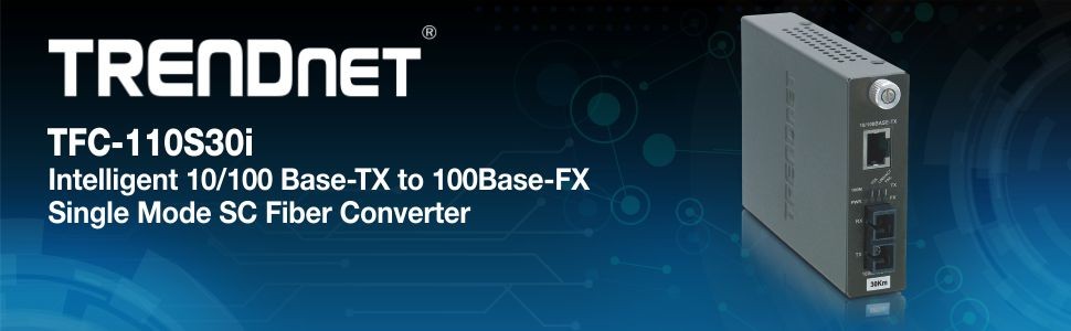 The TFC-110S30i Intelligent Fiber Converter works with the TFC-1600 chassis system or as standalone unit. This converter is a Single Mode SC-Type fiber converter that supports SNMP management and spans distances of up to 30km (18.6 miles). Ports include 1 x 10/100Base-TX (RJ-45) port and 1 x 100Base-FX fiber port (SC-Type).