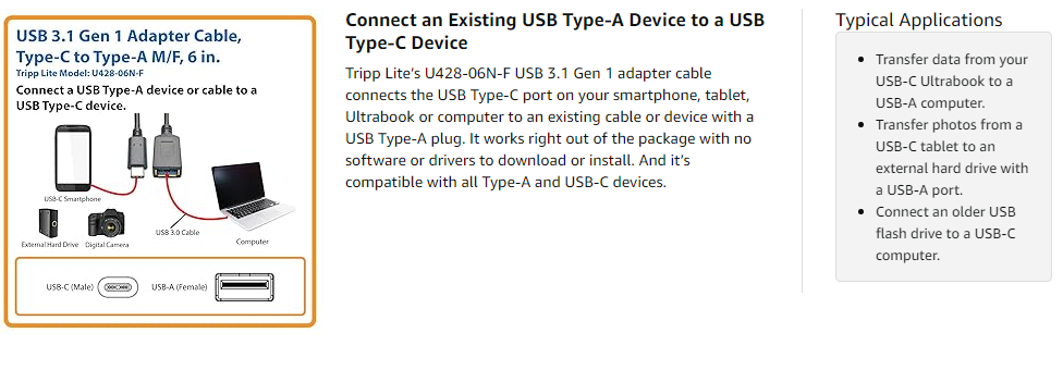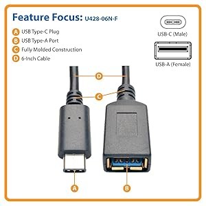 Unlike traditional USB cables that can be attached only one way, the reversible USB-C male connector plugs into a USB port in either direction for a fast, fumble-free connection every time. The portable 6-inch U428-06N-F fits into your backpack or laptop case for easy traveling.