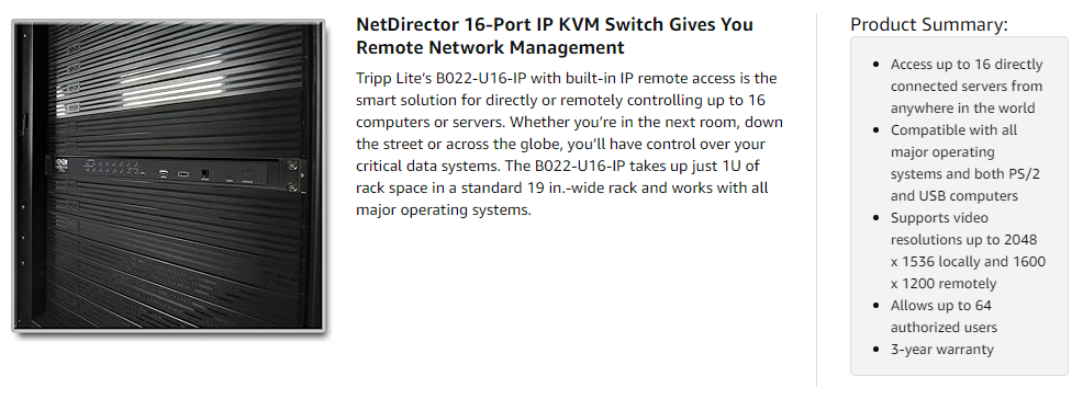 For peace of mind, the B022-U16-IP comes with a three-year product warranty. This switch is manufactured in compliance with strict RoHS specifications, reflecting Tripp Lite’s commitment to environmental responsibility.