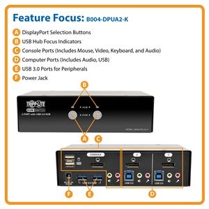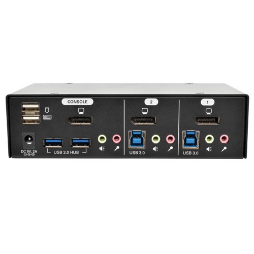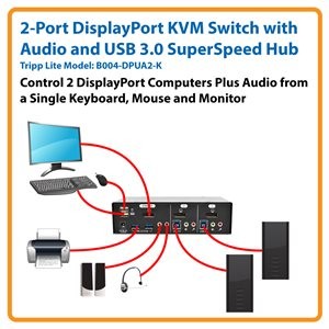 The desktop B004-DPUA2-K 2-Port DisplayPort KVM Switch lets you access, control, boot and reboot two DisplayPort-enabled computers using one DisplayPort monitor, USB keyboard and USB mouse. Switching between DisplayPort computers is quick and simple, and you’ll save money by not needing to purchase a second monitor, keyboard and mouse.