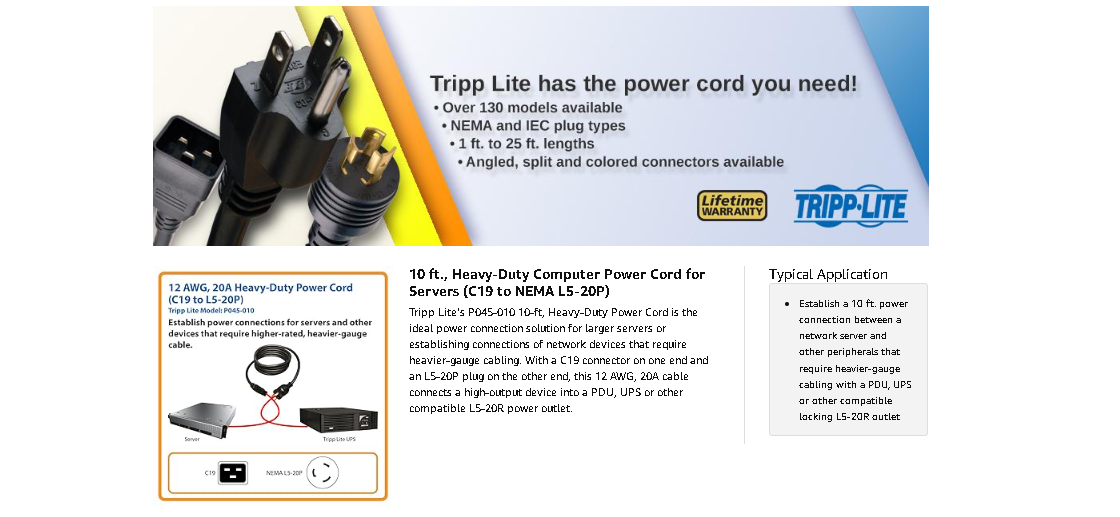 Unlike cut-price power cords, the P045-010 is manufactured using superior materials. The high-quality connectors are designed for reliable service and long life. This heavy-duty SJT cable has three 12 AWG conductors and is rated at 20A for cooler operation.