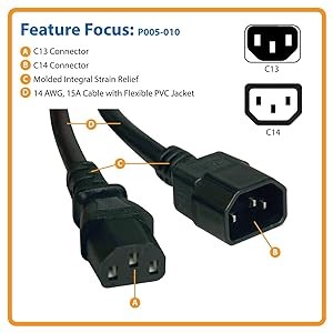Combining heavy-gauge construction with a high amp rating, the P005-010 is designed for demanding server applications. This SJT cable has three 14 AWG conductors and is rated 15 amps, 100-250V.