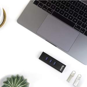 This hub features a sleek, sturdy, and compact black aluminum design perfect for travel and small work spaces. The hub’s LEDs indicate Ethernet diagnostics and USB connectivity. It also features intelligently placed USB ports that ensure all of your devices plug in without interfering with each other.