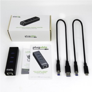 The Plugable USB3-HUB3ME is a simple solution for adding an Ethernet connection to your laptop, ultrabook, and notebook or upgrading your network adapter in your desktop PC. You can also add additional network interfaces and transfer files peer-to-peer over the hub’s wired Gigabit Ethernet network.