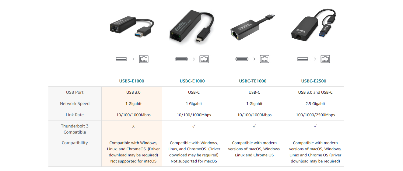 Please note, this adapter is NOT a solution for connecting USB devices like printers, hard drives, etc to a network. This adapter cannot be used to share Ethernet, WiFi, or data between multiple devices. This adapter cannot be used for Preboot Execution Environment (PXE). This adapter is NOT supported on macOS. Please see our comparison chart below for information about supported adapters for macOS.