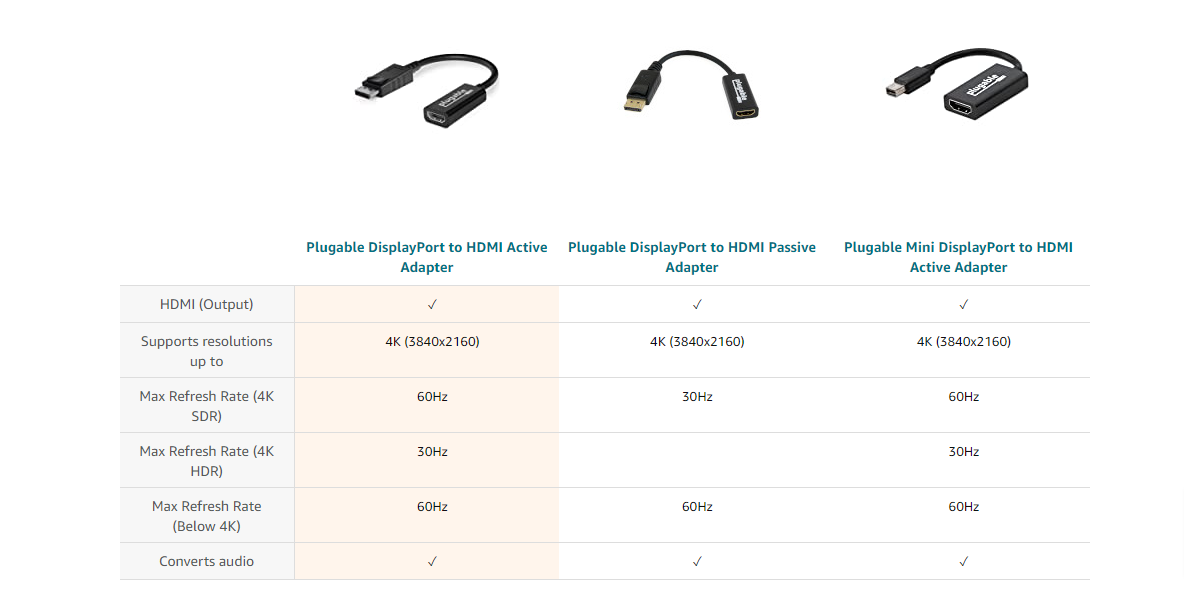How important is an Active Adapter? Active Adapters use an integrated chipset to convert the DisplayPort signal from the computer to an HDMI signal. The Plugable adapter supports resolutions up to 4K (3840x2160) 60Hz on displays with Standard Dynamic Range (SDR), and 4K 30Hz with High Dynamic Range (HDR) capable displays.
