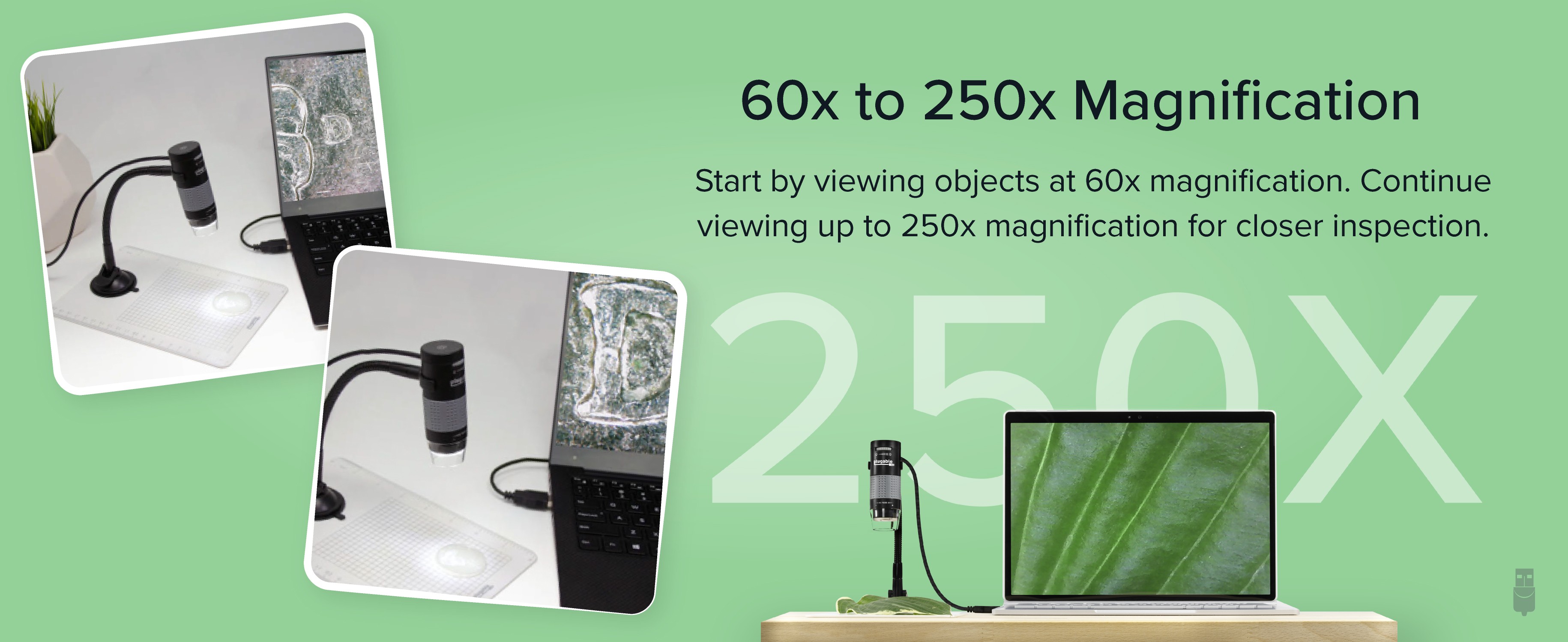 Great for hobbyists and professionals, the Plugable 250x USB 2.0 Digital Microscope (USB2-MICRO-250X) allows you to work quickly and effectively at the microscopic level. Common uses include exploration, stamp or coin analysis, micro-soldering, garden parasite identification, and much more.