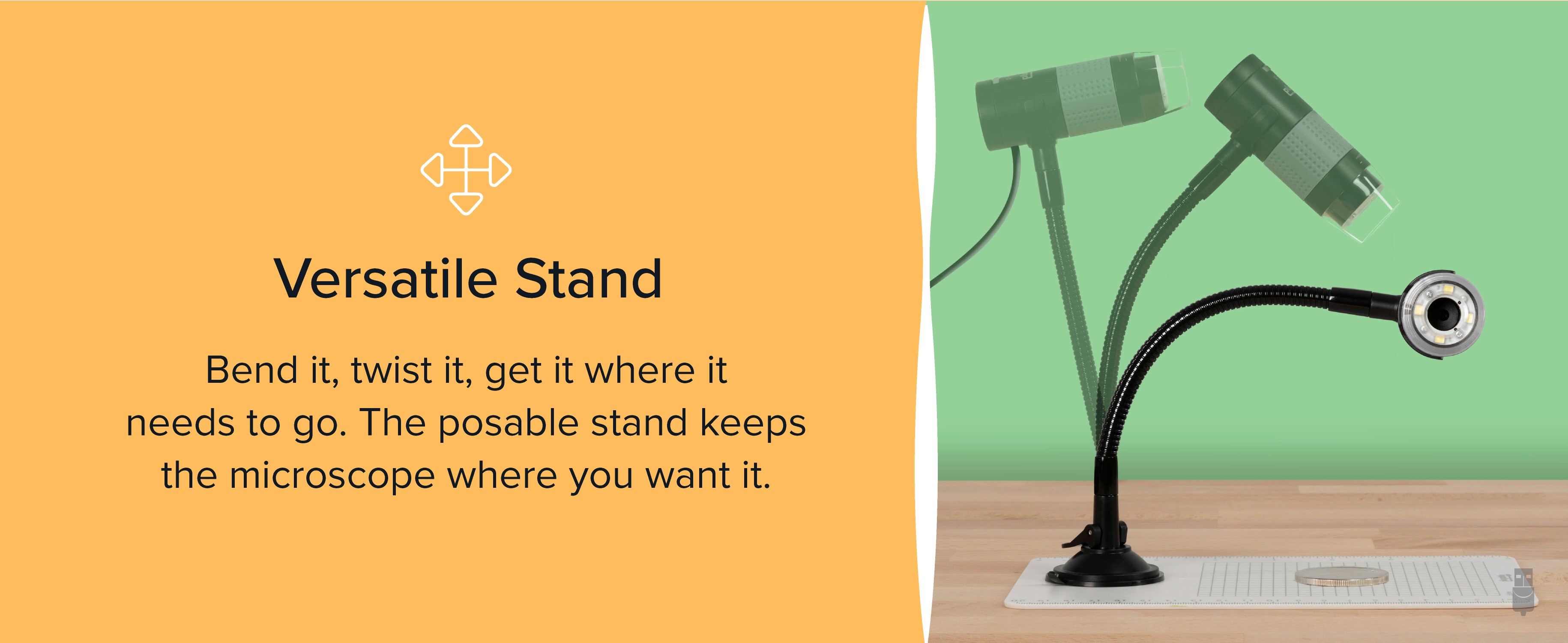 This adaptable tool can be used either with the included stand for lower magnifications, handheld for quick point-and-click inspection, or placed directly on subjects for the highest magnifications. The rugged plastic body makes it ideal for many scenarios including industrial applications.