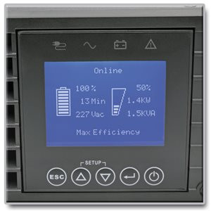 The SUINT3000LCD2U’s front-panel LCD screen allows IT personnel to monitor line power, on-line mode, bypass mode, on-battery, overload, battery low, replace battery and fault status information. An audible alarm signals UPS startup, power failure, low battery, overload and UPS fault conditions.