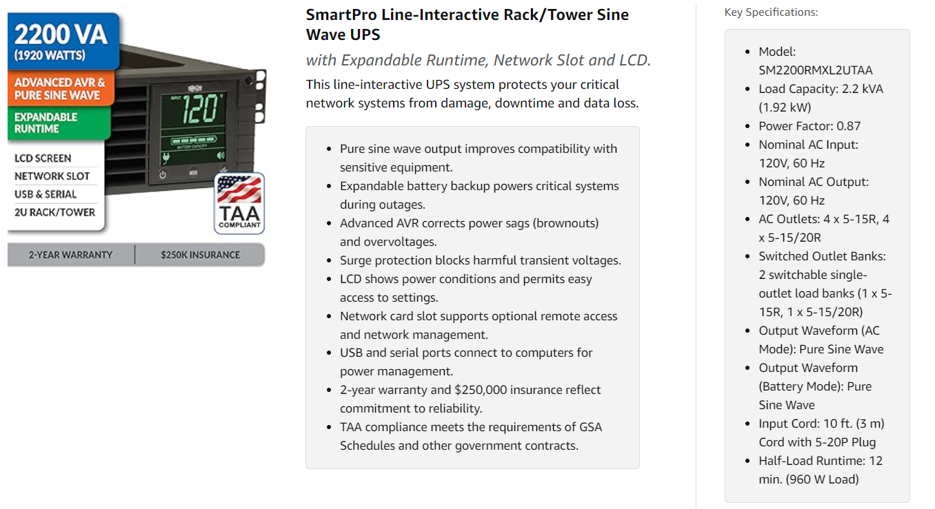 - Half-Load Runtime: This UPS system will support a 50% load (960W) for up to 12 minutes using the included batteries.