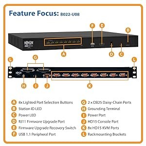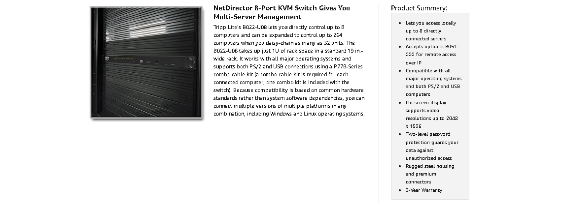 The B022-U08 has a rugged steel housing and premium connectors that are built to last. The firmware is upgradable using the included cable to ensure software remains up to date. Plus, this KVM switch provides flexibility for future expansion by accepting an optional B051-000 server remote control for global access over IP.