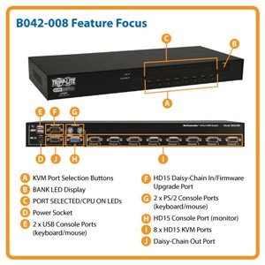 The B042-008 offers a comprehensive, cost-effective network management solution that installs in 1U of rack space. No server-resident software is required, so server performance and reliability are never compromised. Upgradable firmware fine-tunes compatibility with emerging standards.