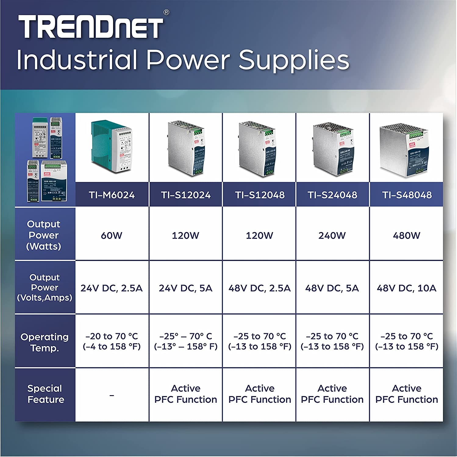 TRENDnet’s high efficiency 120 W Single Output Industrial DIN-Rail Power Supply, model TI-S12048 (Mean Well SDR-120-48), supplies up to 120 Watts (48 V, 2.5 A) of power to industrial PoE equipment such as switches, network cameras, and WiFi access points. This power supply comes with active PFC, an integrated DIN-rail mount, and overload current protection