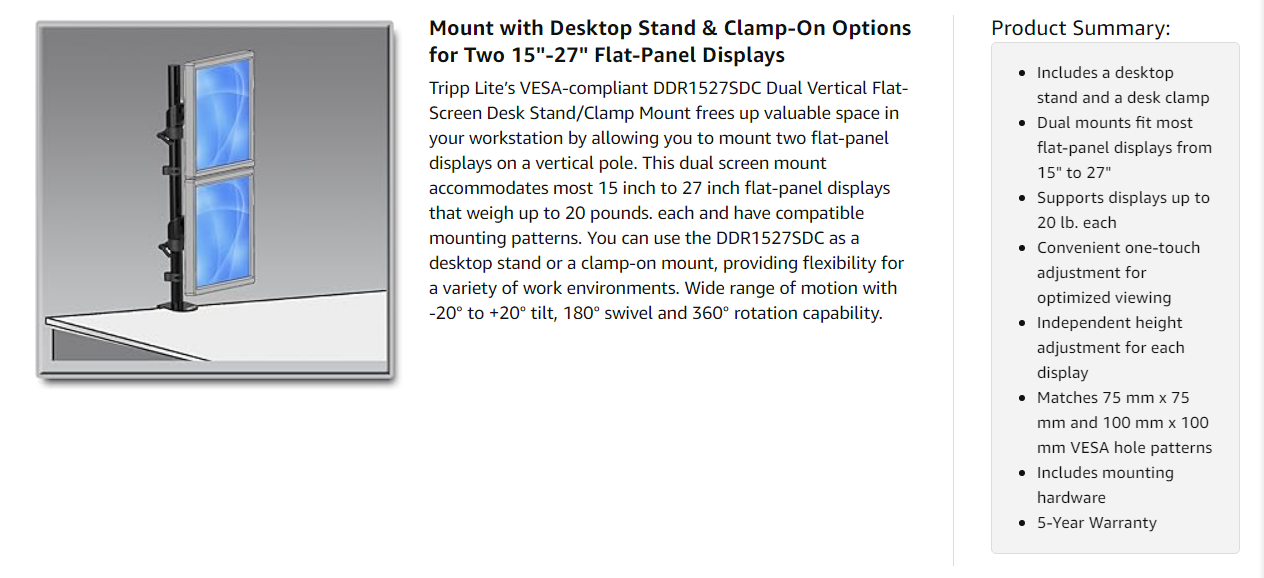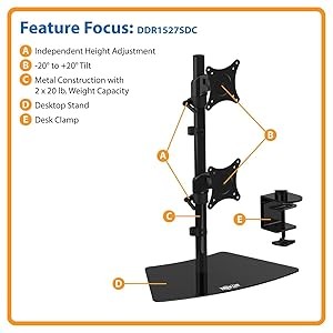 The DDR1527SDC features one-touch adjustment to optimize viewing angles and improve ergonomics as you switch tasks during the day. It upgrades existing displays with a -20° to +20° tilt range, 180° swivel and 360° rotation capability to help you find the most comfortable viewing angle to minimize glare, reduce fatigue and increase productivity. You can also adjust the height of each display independently along the vertical pole.
