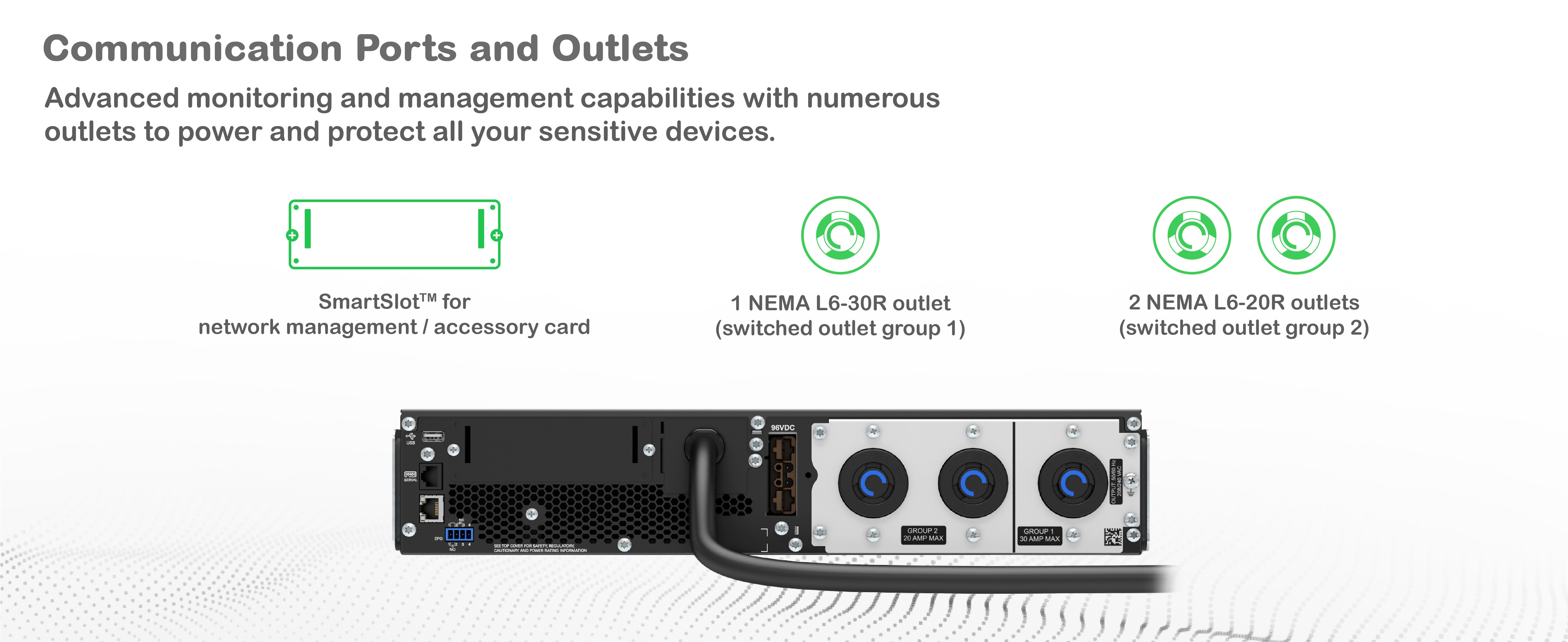 3 outlets in 2U 2 NEMA L6-20R and 1 NEMA L6-30R , including 2 switched outlet groups |