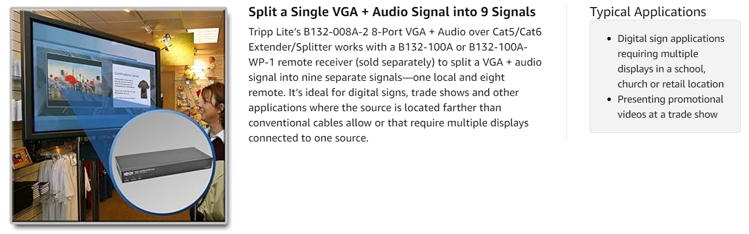 When used with Tripp Lite’s B132-Series active remote receivers, the B132-008A-2 can extend a 1920 x 1440 (60 Hz) signal up to 500 feet and a 1024 x 768 (60 Hz) signal up to 1,000 feet. The unit uses VGA cable to connect to the source and displays and Cat5e/6 cable to transmit to the remote receivers.