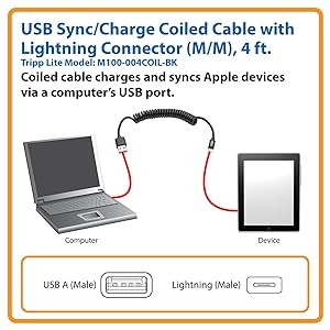 Tripp Lite’s M100-004COIL-BK USB Sync/Charge Coiled Cable connects your latest-generation iPhone, iPad or iPod to the USB-A port on your USB charger, laptop or desktop computer, so you can charge your Apple device and transfer data at the same time. The cable features a reversible Lightning plug that connects to your Apple device in either direction, ensuring a fast, fumble-free connection.