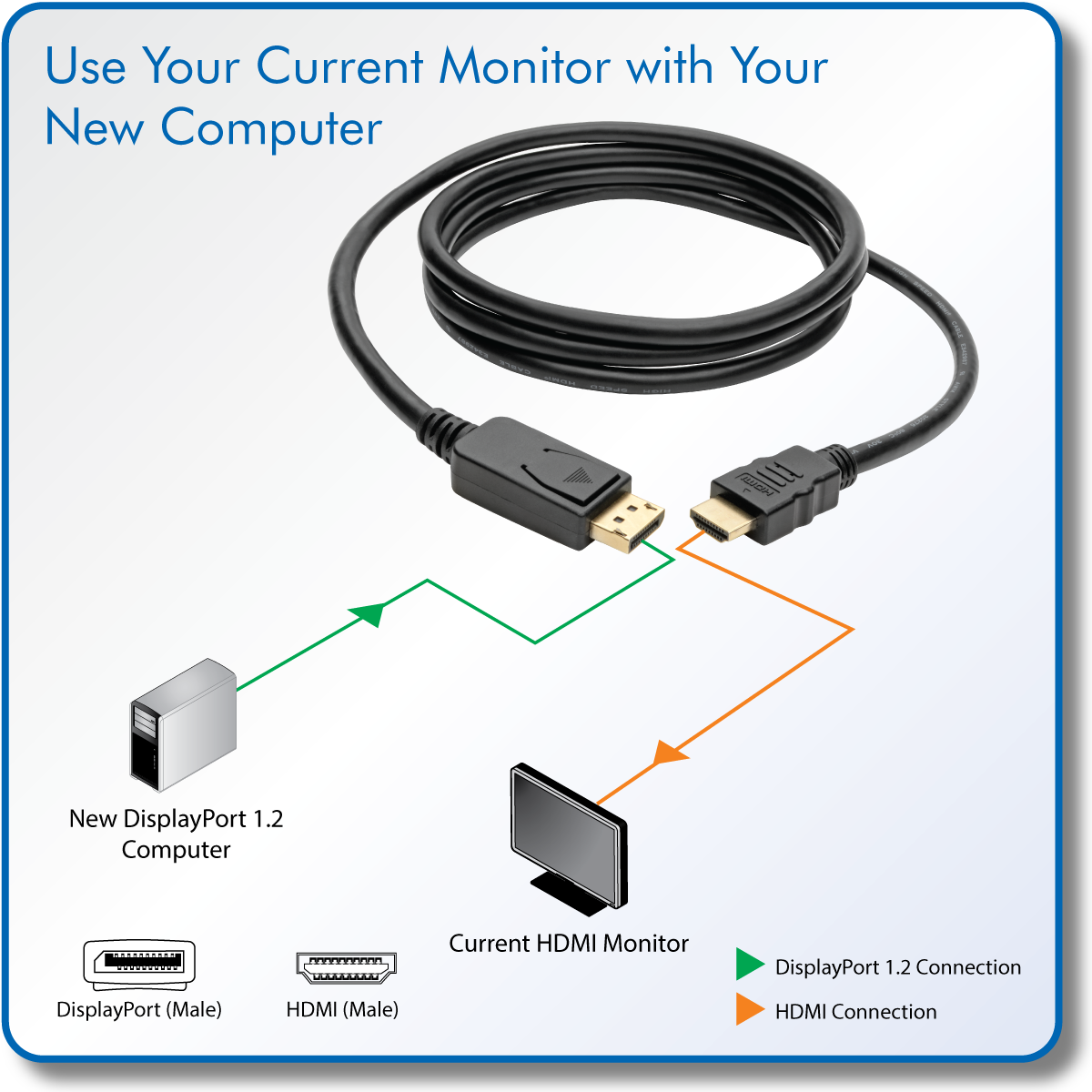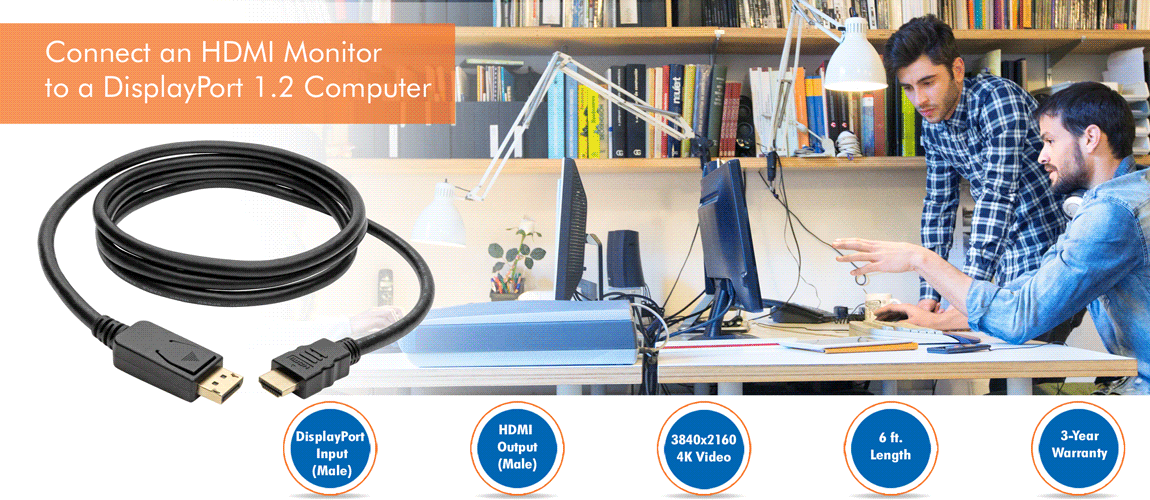 This 6 ft. adapter cable allows you to connect an HDMI monitor to a desktop or laptop computer with DisplayPort 1.2 video output. Simply plug the cable into your DisplayPort computer and your HDMI monitor. You don’t need a separate adapter or device cable.