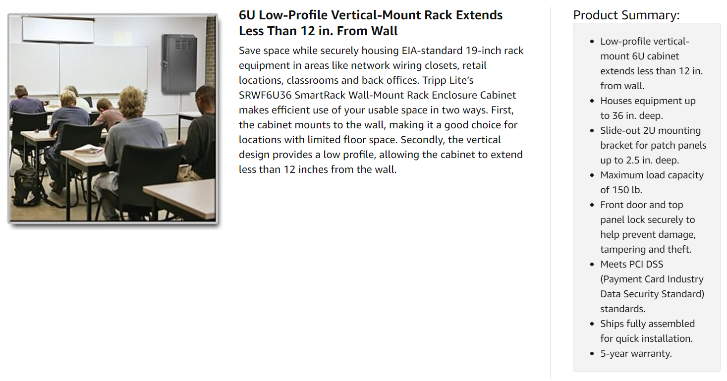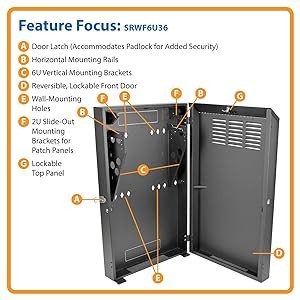 The SRWF6U36 provides the physical equipment and media security required for PCI DSS (Payment Card Industry Data Security Standard) compliance. The front door and top panel lock securely to help prevent damage, tampering and theft. You can add your own padlock to the front door latch for extra security. The cabinet is made of heavy-duty steel with a durable black powder-coated finish.