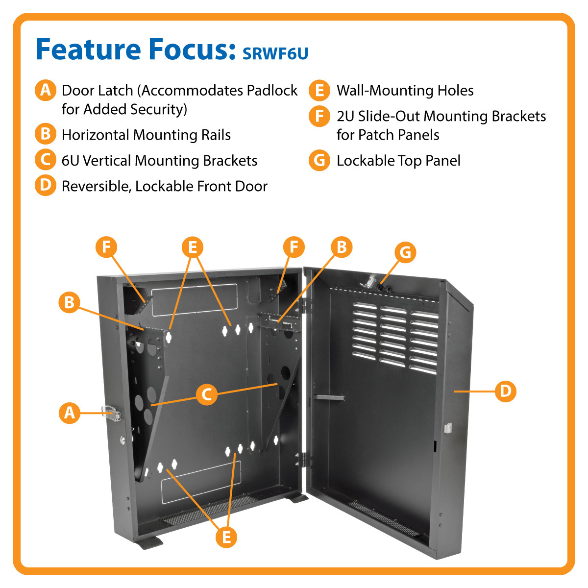 Keeps Important Equipment SecureThe SRWF6U comes fully assembled and ready to mount to the wall. Rear mounting holes are spaced 16 inches apart for standard wall stud placement. Equipment installation is easy with threaded mounting holes and hardware that supports M6 or 12-24 mounting. Rack spaces are marked for easy reference. The locking top panel flips open to allow quick access to connected equipment.