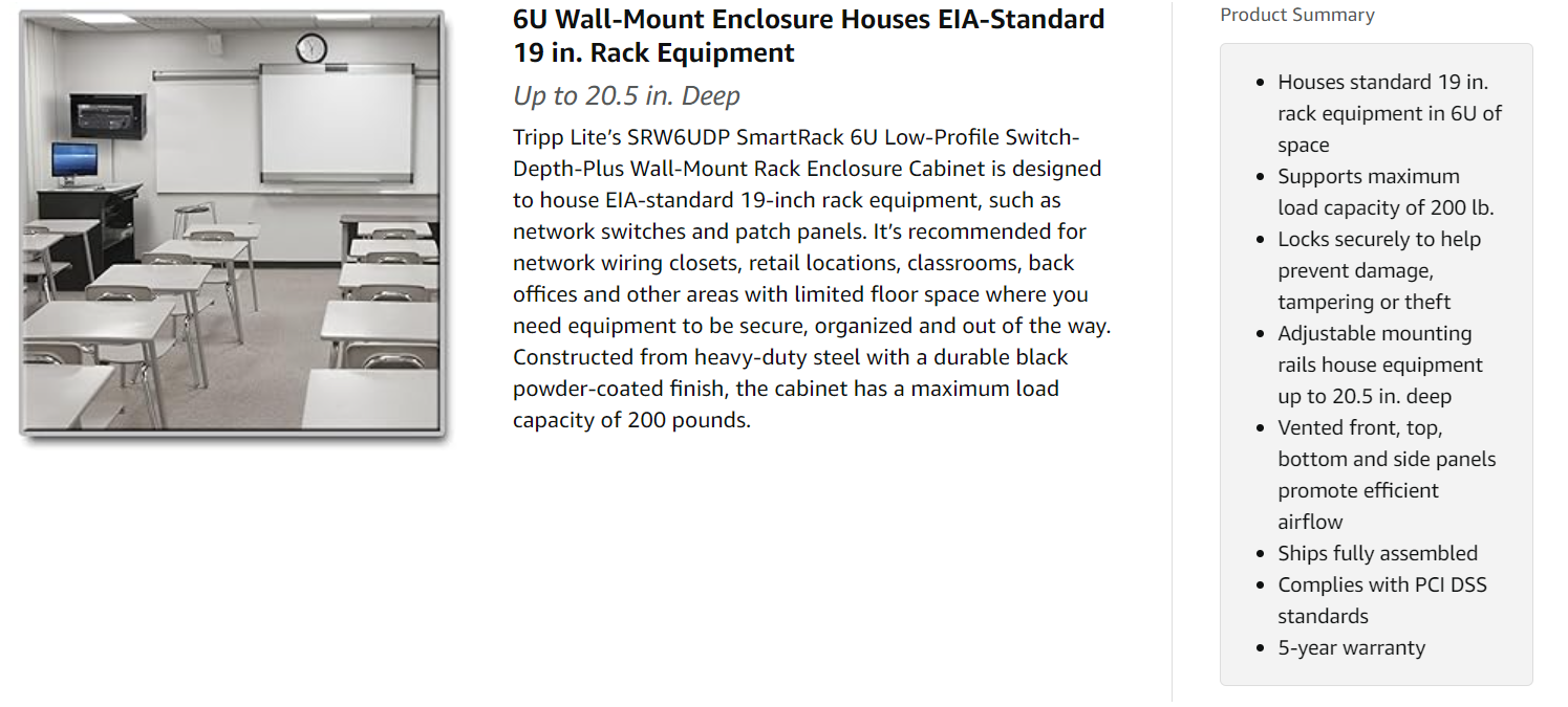 The SRW6UDP comes with a 5-year product warranty. It’s manufactured in compliance with strict RoHS specifications, reflecting Tripp Lite’s commitment to environmental responsibility.