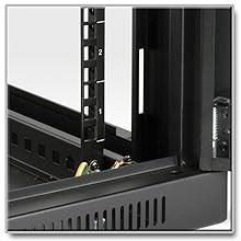 The front door and side panels are ventilated, which allows air to flow freely through the cabinet to keep equipment cool. Vented top and bottom panels help remove warm air from the enclosure and draw in cool air by convection. They also support the installation of optional cooling fans, such as Tripp Lite’s SRFANWM fans (sold separately).