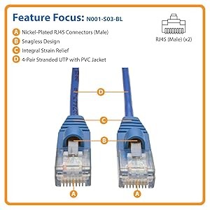 Manufactured from 28 AWG copper wire, the N001-S03-BL delivers speeds up to 350 MHz/1 Gbps. Nickel-plated RJ45 male connectors guarantee an accurate signal transfer. The snagless design protects the locking tabs from being damaged or broken off during installation. Integral strain relief ensures the cable and connectors last a long time.