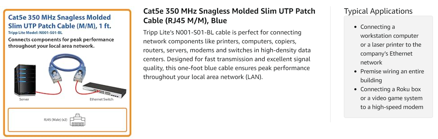 Protected by a PVC jacket, the four-pair stranded UTP N001-S01-BL is more than 25% smaller in diameter than standard Cat5e cable. This increases airflow in tight spaces and makes the cable easier to install around corners and through cable management panels.