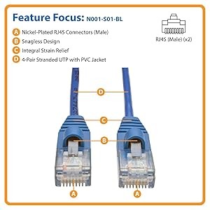 Manufactured from 28 AWG copper wire, the N001-S01-BL delivers speeds up to 350 MHz/1 Gbps. Nickel-plated RJ45 male connectors guarantee an accurate signal transfer. The snagless design protects the locking tabs from being damaged or broken off during installation. Integral strain relief ensures the cable and connectors last a long time.