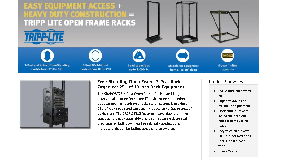 The SR2POST25 comes with a 5-year warranty. It’s manufactured in compliance with strict RoHS specifications, reflecting Tripp Lite’s commitment to environmental responsibility.