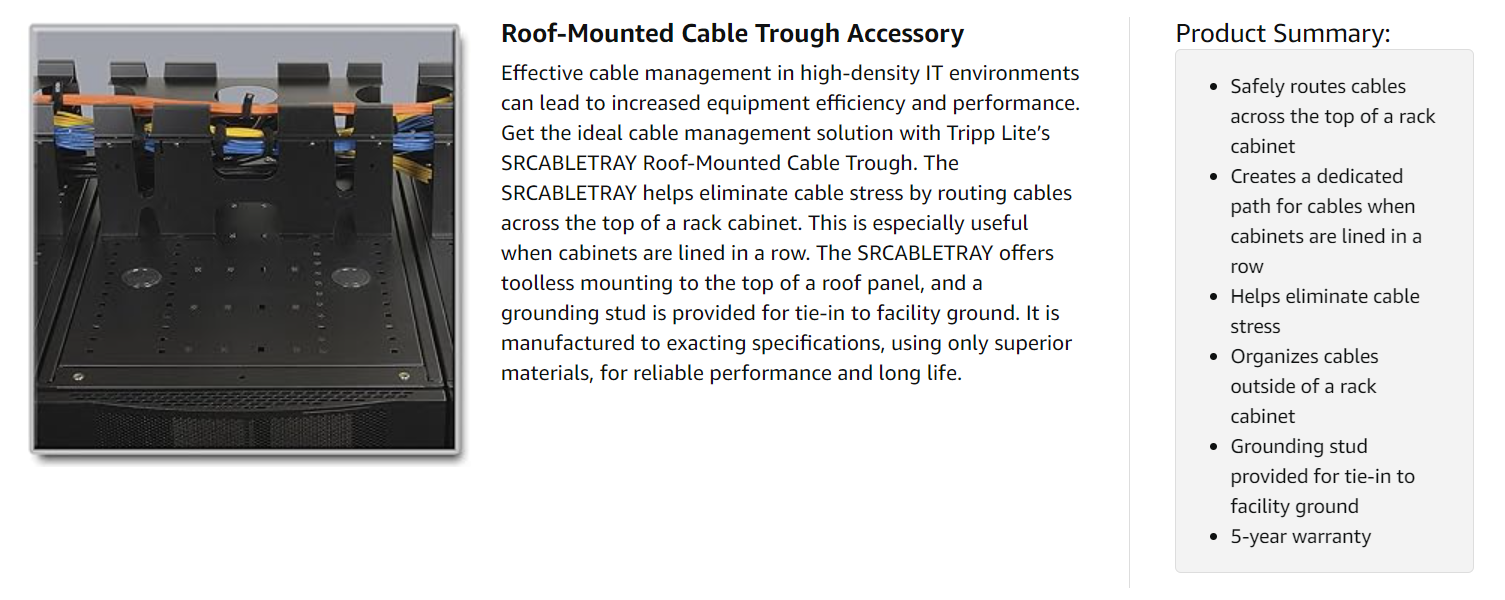 The SRCABLETRAY comes with a 5-year warranty and is RoHS-compliant, reflecting Tripp Lite’s commitment to environmental responsibility.
