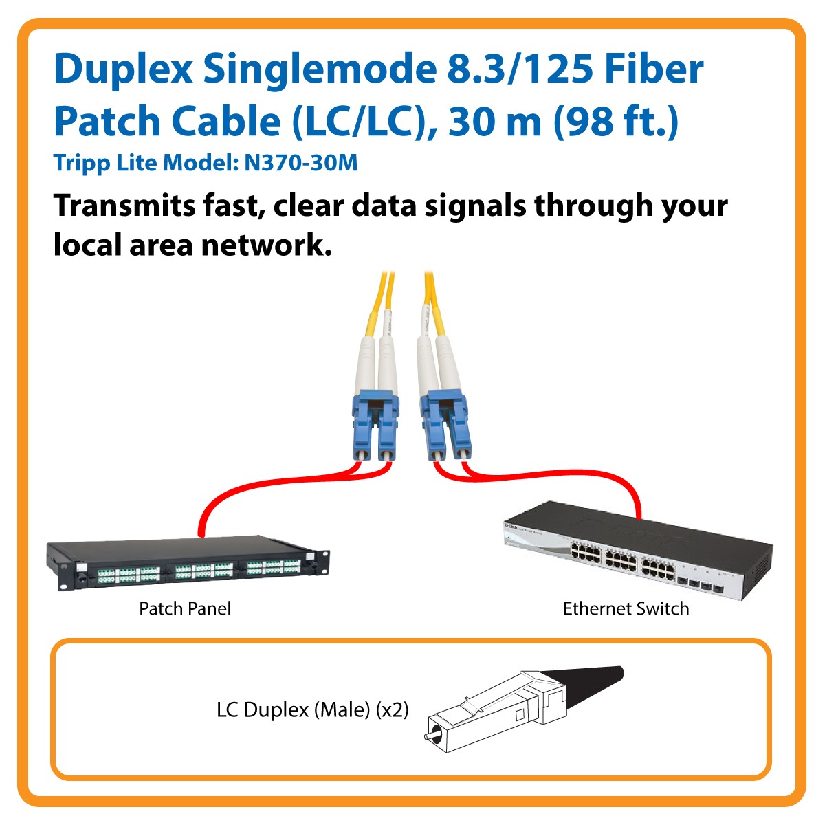 The N370-30M Duplex Singlemode 8.3/125 Fiber Patch Cable (LC/LC) transmits fast, clear data signals through your LAN with a higher bandwidth than multimode cable for up to twice the throughput. Designed for network equipment that requires singlemode fiber optic patch cables, this 30-meter (100-foot) cable has attenuation loss that meets or exceeds current standards.