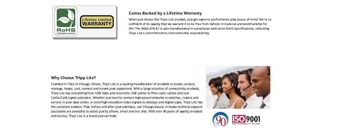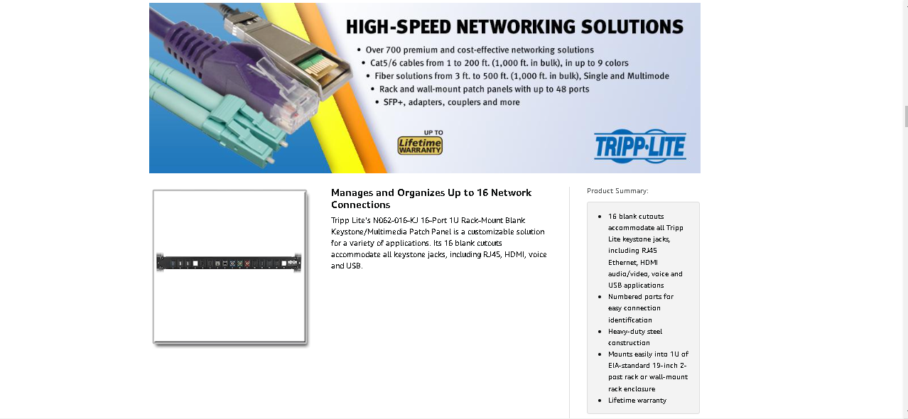 Made from heavy-duty cold-rolled steel, the N062-016-KJ mounts easily into 1U of an EIA-standard 19-inch two-post rack or wall-mount rack enclosure using the included hardware. Grounding wire is also included.