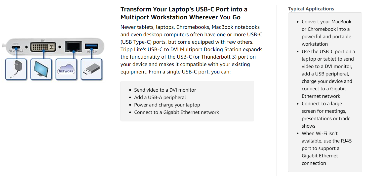 Because just one USB-C connection provides four different ports, you don’t need multiple docking station while on the go. This docking station is also bus-powered, so you don’t have to travel with the weight of a separate external power supply.