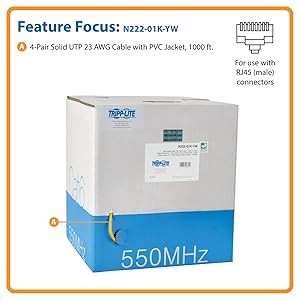 The N222-01K-YW is built to last in high-demand data center and networking applications. Manufactured from 23 AWG copper wire, it delivers speeds up to 550 MHz/1 Gbps. Protected by a durable CMR-rated PVC jacket, this cable drastically reduces impedance and structural return loss and keeps near-end crosstalk levels to a minimum. It is ideal for all non-plenum horizontal wiring applications, including 10/100/1000 Base-T Ethernet, 100 Mbps TPDDI, 155 Mbps ATM, ISDN, voice, EIA/TIA and Token Ring Type 3. It meets or exceeds most current industry standards, including IEEE 802.3ab, IEEE 802.5, ANSI/EIA/TIA 568, ISO/IEC 11801 and ETL (category 6, draft 11).