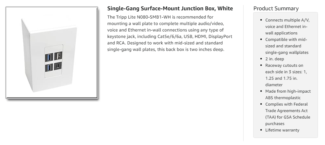 Made from robust ABS thermoplastic, the N080-SMB1-WH is colored white to blend elegantly into any home or office decor for a sleek, professional installation. Two mounting screws are included.