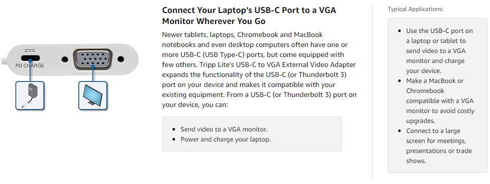 This adapter supports USB DisplayPort Alternate Mode (Alt Mode) for carrying high-definition video to a VGA monitor or projector. It supports video resolutions up to 1920 x 1080 at 60 Hz, including 1080p.