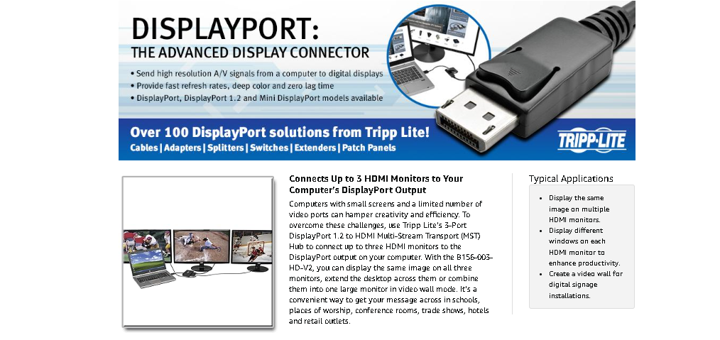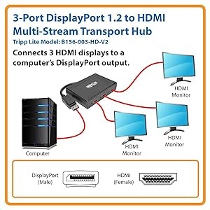 The B156-003-HD-V2 is compliant with DisplayPort 1.2 and backward compatible with versions 1.1 and 1.1a with the feature set being limited to that of your equipment. It supports UHD video resolutions up to 3840 x 2160 (4K x 2K) at 24/30 Hz. In video wall mode, it supports expanded resolutions, such as 5760 x 1080 in a horizontal 1 x 3 monitor configuration or 1920 x 3240 in a vertical 3 x 1 configuration. This MST hub also supports HDCP, EDID, DDC and 48-bit Deep Color (16 bits per channel), as well as DTS-HD, Dolby TrueHD and 7.1-channel surround sound audio.
