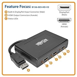 You can use the B156-003-HD-V2 with all operating systems. Plug-and-play convenience means no software or drivers are needed. A built-in six-inch cable connects directly to a DisplayPort source. An external power supply is included to power the unit. LEDs indicate when the monitors are receiving a signal.