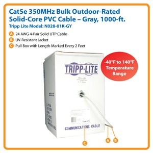This 1000-ft. Tripp Lite Cat5e 350MHz Bulk Outdoor-Rated Solid-Core PVC Cable is the premium solution for long distance runs to outdoor wireless antennas. The N028-01K-GY operates in temperatures as low as -40°F (-40°C) and as high as 140°F (60°C).