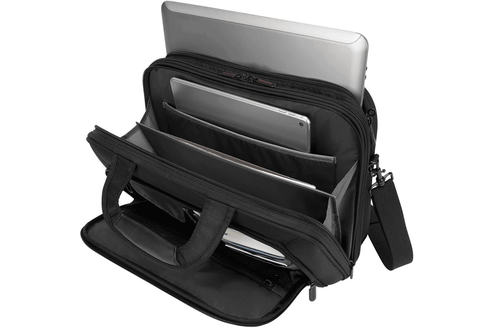 Designed with the traveling professional in mind, the Targus® 15–16” Mobile Elite Checkpoint-Friendly Briefcase fits all of your workday needs in a sleek, compact body. With ample space and multiple interior and exterior pockets, you can keep your files and supplies organized while protecting your tech. Plus, this case features the SafePort® Sling Protection System and a polyurethane water-resistant bottom, so you can rest assured your laptop is safe from accidental drops and spills.