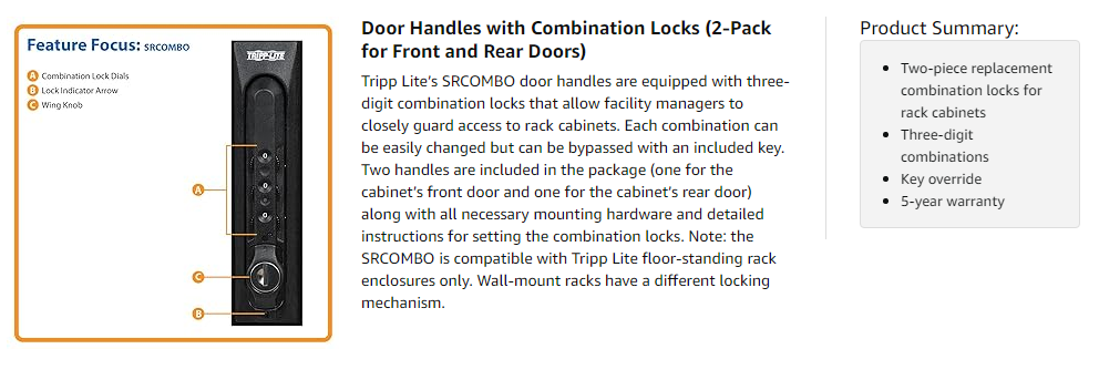 With heavy-duty steel construction and three-digit combinations that can only be bypassed with a key, Tripp Lite’s SRCOMBO door handles are the perfect solution for adding security to your rack cabinets.